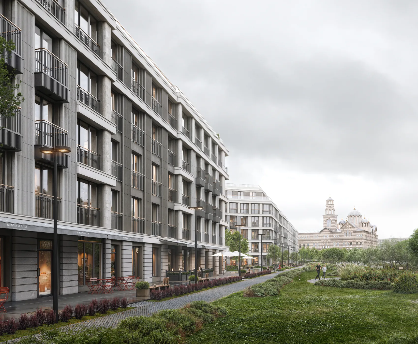 Архитектурное решение iD Petrogradskaya сочетает строгую симметрию с геометрической точностью. Квартал состоит из нескольких