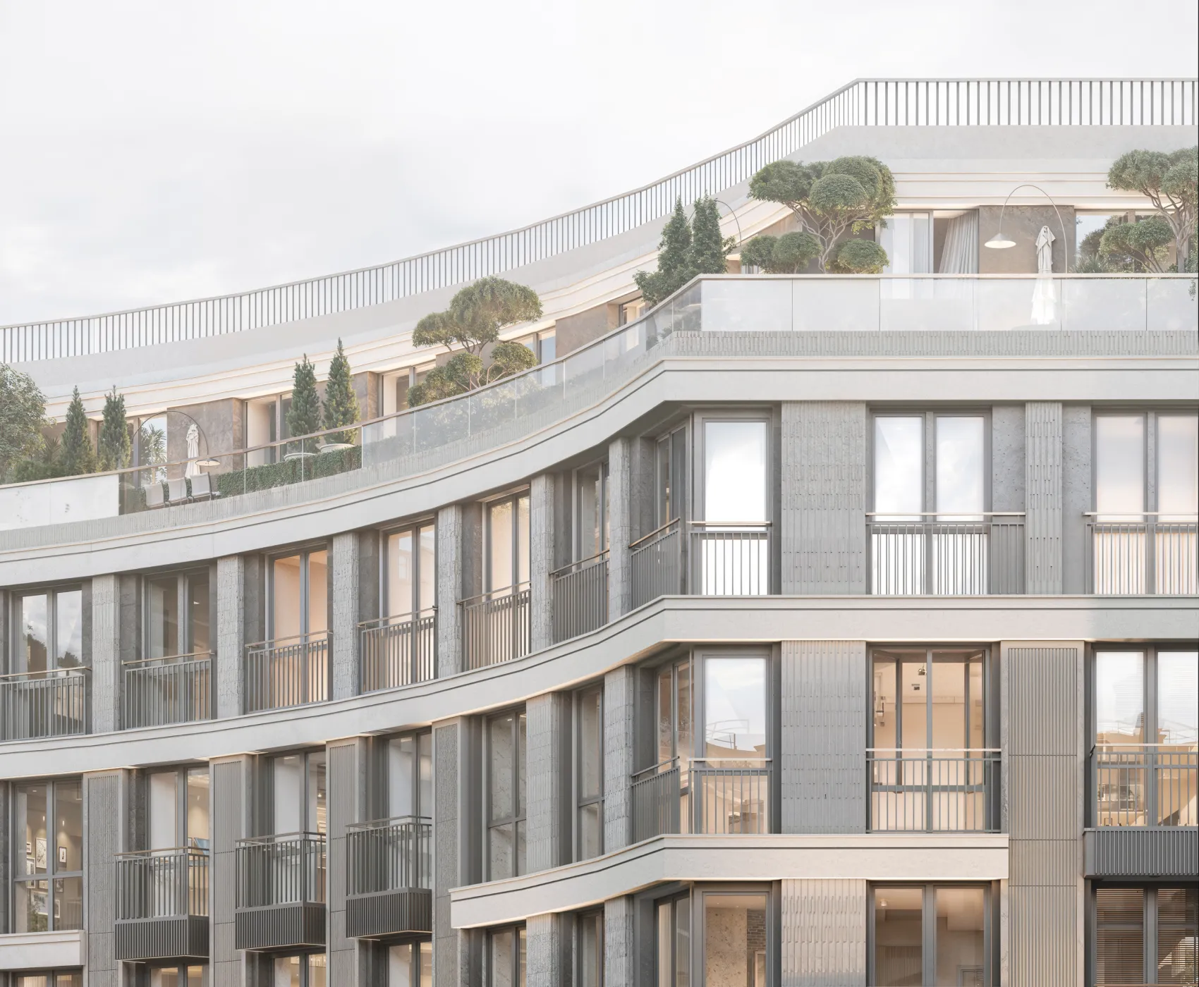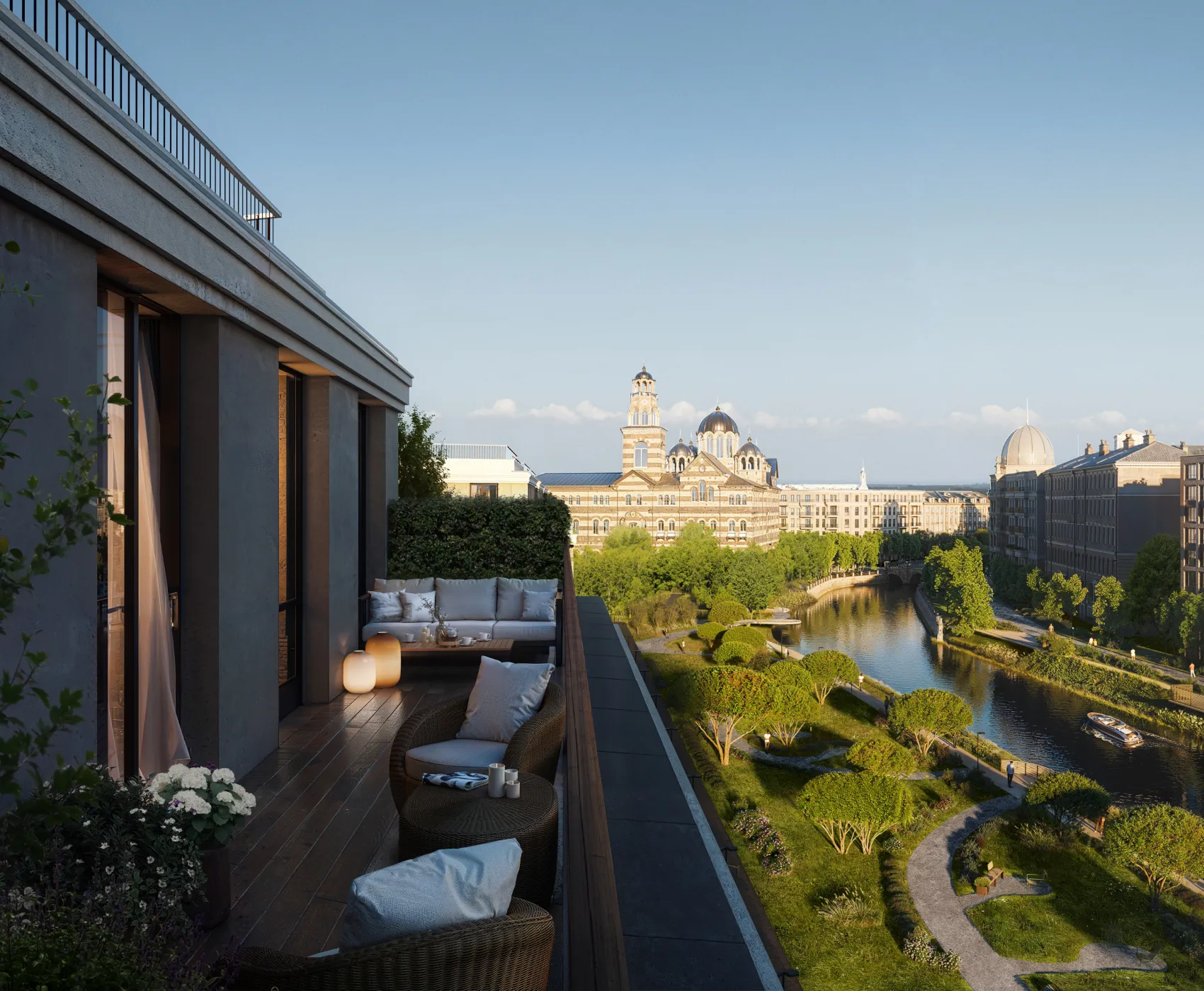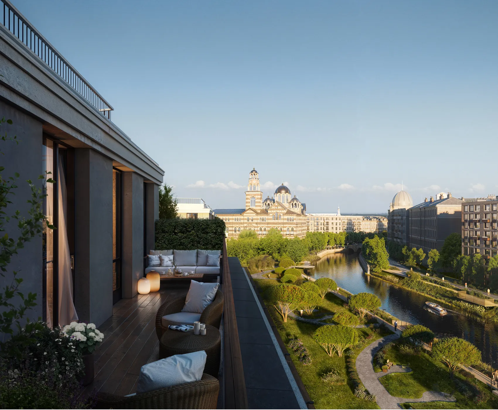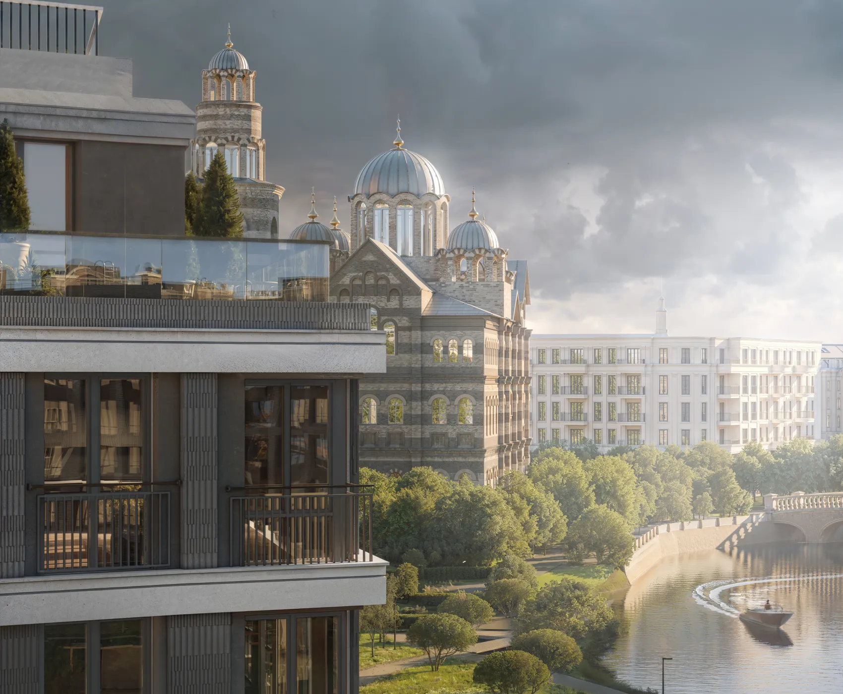 На верхних этажах, ориентированных на набережную, созданы террасы с потрясающими видами на историческую застройку — одной из главных доминант которой является Иоанновский женский монастырь, построенный в начале XX века. Приглушённые бежево-серые тона фасадов с терракотовыми акцентами на первых этажах и балконах отлично гармонируют с архитектурными решениями зданий Петроградской стороны.